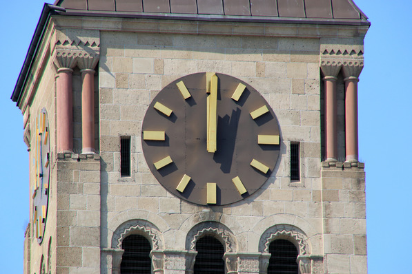 Ein Malermeister beauftragt seinen Azubi, das Ziffernblatt einer Kirchturmuhr neu zu streichen.