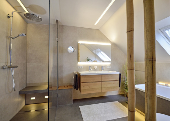 Ein großzügiger Duschbereich, eine Badewanne für zwei, ein WC und ein Doppelwaschtisch – da war einiges unterzubringen in einem Bad mit 10 m² Grundfläche. Herausfordernd dabei war vor allem die Dachschräge. Andrea Stark-Nienhaus erläutert, wie sie alle Kundenwünsche unter einen Hut bzw. unter ein Dach gebracht hat.