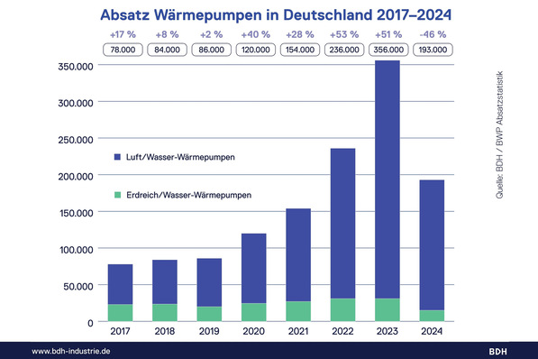 Die Heizungsindustrie meldet für das Jahr 2024 einen Absatz von 193.000 Heizungs-Wärmepumpen in Deutschland – formal entspricht das einem Rückgang um 46 %.