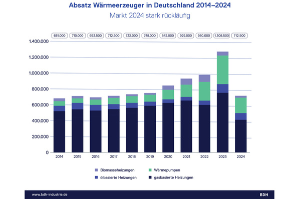 Nach dem Rekordjahr 2023 bewegt sich der Absatz von Wärmeerzeugern wieder zum langjährigen Durchschnittsniveau vor der Wachstumsphase ab 2020.