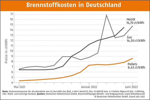 Holzpellets haben sich im Juni 2022 kräftig verteuert. Der Pelletpreis lag mit 431,56 Euro/t nun 95 % über dem Vorjahresmonat und 9,7 % über dem Vormonat.