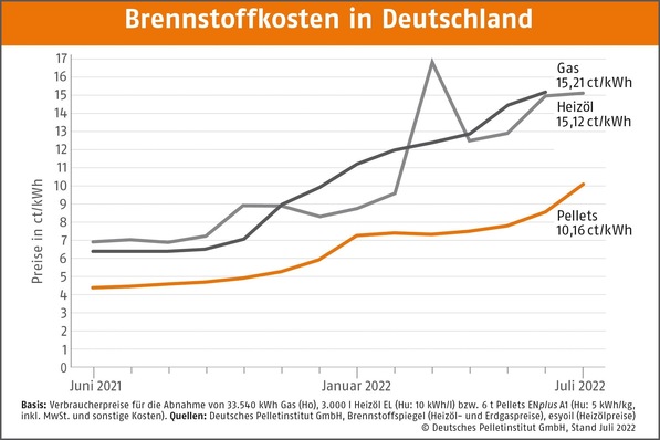 Holzpellets haben sich im Juli 2022 kräftig verteuert. Der Pelletpreis liegt mit 507,83 Euro/t nun 125,5 % über dem Vorjahresmonat und 17,7 % über dem Vormonat.