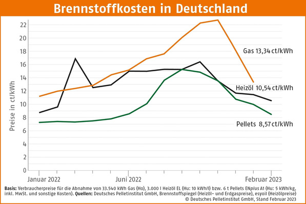 Der Preis für Holzpellets ist im Februar 2023 gegenüber dem Vormonat um 14,6 % auf 428,52 Euro/t deutlich gesunken. Das Preisniveau ist aber weiterhin hoch.