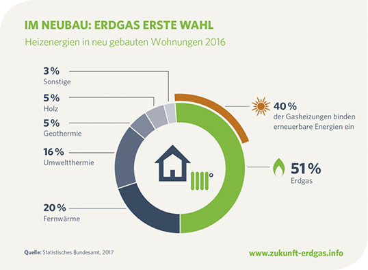 Nach Daten des Statistischen Bundesamtes nutzen rund 51 % der 2016 fertiggestellten Wohngebäude eine Gasheizung als wichtigste Wärmequelle. Es folgen Fernwärme (20 %) und Umweltthermie (16 %). Damit bleibt Erdgas sowohl im Gebäudebestand als auch im Neubau Marktführer. Den Anspruch des...