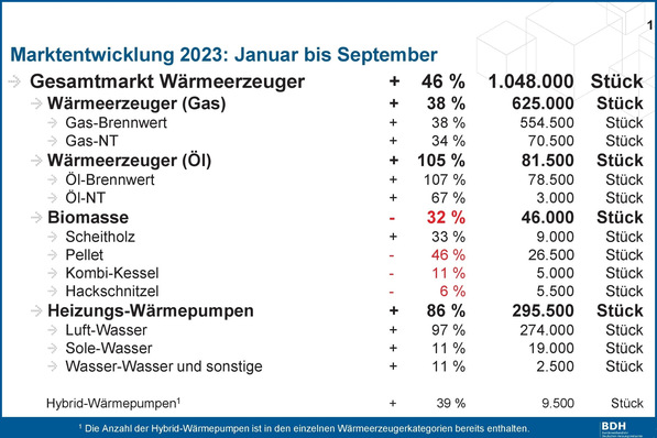 Der Markt für neue Heizungen in Deutschland bewegt sich aktuell auf hohem Niveau. Bis zum 3. Quartal 2023 wurden über 1 Mio. Wärmeerzeuger verkauft.
