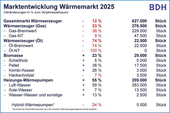 Der Absatz für Heiztechnik war im Jahr 2025 in der Hälfte der vom BDH gemeldeten Produktsegmenten rückläufig. Die Entwicklung folgt zumeist der Wärmewende.