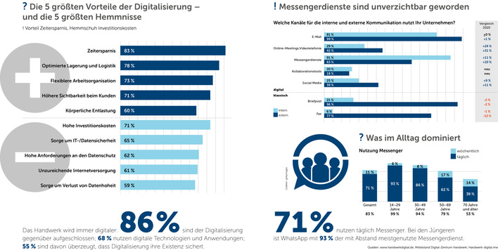Mehr digitale Möglichkeiten im Handwerk führen auch zu mehr Wegen, mit den Mitarbeitern, mit Partnergewerken und letztlich auch mit Kunden zu kommunizieren. Digitale Kanäle werden zunehmend genutzt, sei es der Rechnungsversand per Mail oder das Führen einer digitalen Bauakte. Für Letztere bieten sich zunehmend handwerksspezifische Messengerdienste wie MemoMeister oder Craftnote an. Onlinemeetings und Videotelefonie haben ebenfalls zugenommen.