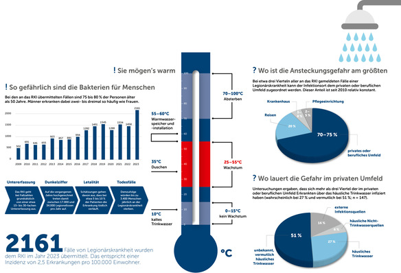 Die Legionärskrankheit ist eine schwere Form der Lungenentzündung. Sie kann Verwirrtheit, Bauchschmerzen oder Durchfälle verursachen und auch zum Tode führen. Wer sich die Zahlen und Fakten rund um Legionelleninfektionen in Deutschland vor Augen führt, erkennt, welches Gefahrenpotenzial in der Trinkwasseranlage lauert. Zu Recht wird auf das Thema Wert gelegt. SHK-Betriebe sind gut beraten, sich im Bereich der Trinkwasserhygiene auf dem Laufenden zu halten.