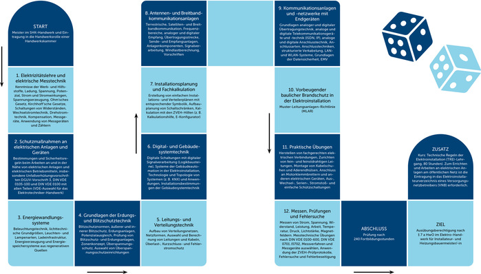 Das Seminar „Elektrotechnik für den/die SHK-Meister/in“ nach § 7a Handwerksordnung (HwO) vermittelt Wissen, damit Teilnehmende erfolgreich im Bereich Elektrotechnik tätig sein können. Die Ausbildung legt den Schwerpunkt auf Technik und Theorie, weniger auf handwerkliche Fertigkeiten. Mit bestandener Prüfung (inkl. TREI-Lehrgang) werden die Voraussetzungen für den Eintrag in die Handwerksrolle sowie in die Installateurverzeichnisse der Energieversorger geschaffen. Dauer: 240 Stunden, plus 80 Stunden TREI-Lehrgang.