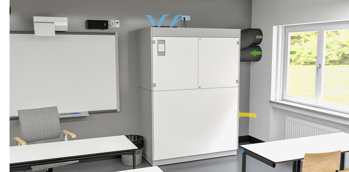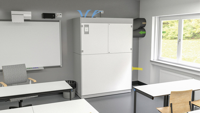 Das stehende Schullüftungsgerät WZA (HBT: 210 × 150 × 66 cm) benötigt nur geringe bauliche Maßnahmen für den Außen- und Fortluftdurchlass in der Fassade (Kernbohrungen oder Austausch eines Oberlichts). Ab Werk verdrahtet ist die Lösung nach der Aufstellung steckerfertig einsatzbereit.