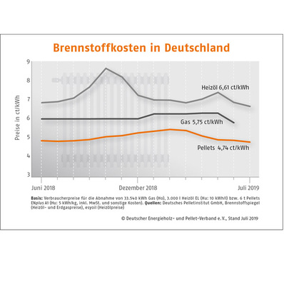 Im Bundesdurchschnitt kosten Pellets im Juli 233,66 Euro pro Tonne. Sie sind damit 1,8 % günstiger als im Juni 2015 und rund 6 % günstiger als im Juli 2014. Der Preis für ein Kilogramm Holzpellets beträgt 23,37 Cent, eine Kilowattstunde (kWh) Wärme aus Pellets kostet 4,67 Cent. Der Preisvorteil...