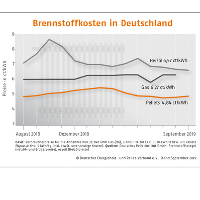 Der Pelletpreis im September ist im Vergleich zum Vormonat geringfügig angestiegen, und zwar um 1,4 %. Laut Angaben des Deutschen Energieholz- und Pellet-Verbands e.V. (DEPV) kostet 1 Tonne Pellets im Schnitt 242,10 EUR (Abnahmemenge 6 Tonnen (t)).