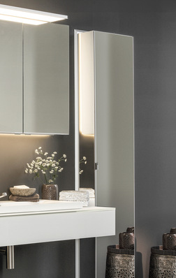 Mit dem Expose-Line Spiegelschrank revolutioniert SPRINZ die Art und Weise, wie Stauraum im Badezimmer integriert wird. Dieses neue Modell zeichnet sich durch sein klares, minimalistisches Design aus und ist aus hochwertigem Aluminium gefertigt, verfügbar in den Oberflächen Silber matt und Schwarz matt. Die umlaufende LED-Beleuchtung, sanft eingebettet hinter einer teilweise sandgestrahlten Umrahmung, sorgt für eine blendfreie und gleichmäßige Ausleuchtung.