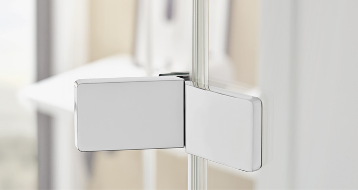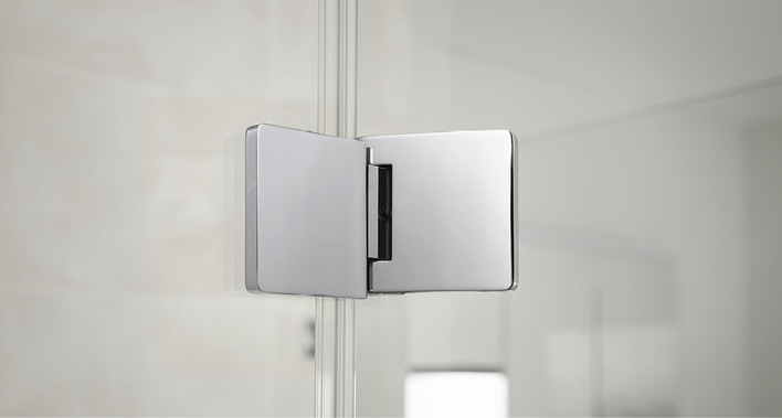 Die Glasdusche Vega von Sprinz hat eine Besonderheit: Wo man sonst den Drehmechanismus sieht, schiebt sich die bewegliche Beschlagkappe seitlich über die Federtechnik und verdeckt den Spalt. So entsteht eine durchgängige Optik ohne die sonst übliche Fuge zwischen den Beschlagteilen. Man sieht immer...