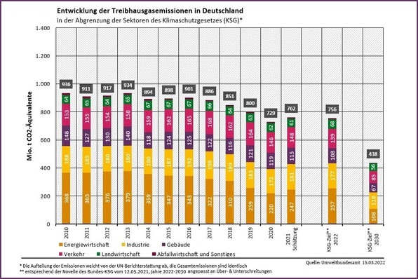 2021 sind die Treibhausgasemissionen in Deutschland um ca. 4,5 % deutlich gestiegen. Mit einer Minderung von 38 % wurde das 2020-Klimaziel wieder verfehlt.
