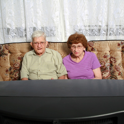 Ein Rentner-Ehepaar sitzt vor dem Fernseher und wartet auf die Fußball-Übertragung.