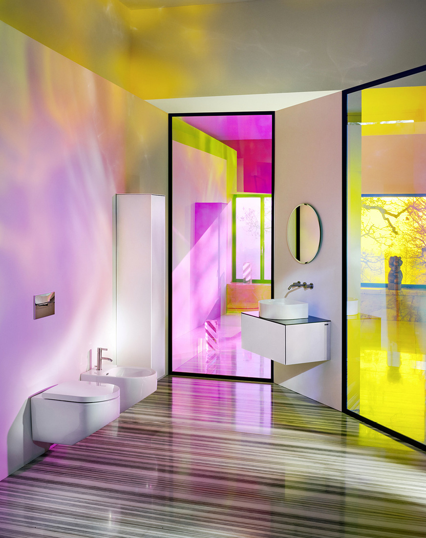 Wollen wir kurz nach Materialien schauen: Nussbaum und Eiche sind als einheimische Hölzer seit Jahren beliebt und gelten als nachhaltig, dazu gesellt sich gern Naturstein wie Marmor, hell mit dunklen Adern oder dunkelgrau bzw. dunkelgrün mit heller Aderung. Ebenfalls sind Schiefer und Beton schon lange populär. Für Armaturen kommen Bronze, Messing und Kupfer sowie Schwarz als Alternative zu poliertem Chrom ins Spiel, in matt, gebürstet oder poliert. Das hat sich noch nicht so stark durchgesetzt, stellt aber einen echten Anreiz zur Modernisierung dar. Ebenfalls kann man mit der Duschabtrennung Akzente setzen: Kommt vielleicht farbiges Glas oder eine Beschichtung mit Folie infrage? Die Firma Laufen aus der Schweiz zeigte eindrucksvolle Fotos zu dieser bisher wenig genutzten kreativen Möglichkeit (Bild 5). Die Folienbeschichtung ist dabei natürlich um einiges günstiger als „dichroitisch“ beschichtetes Glas, wie man diesen Effekt nennt.
