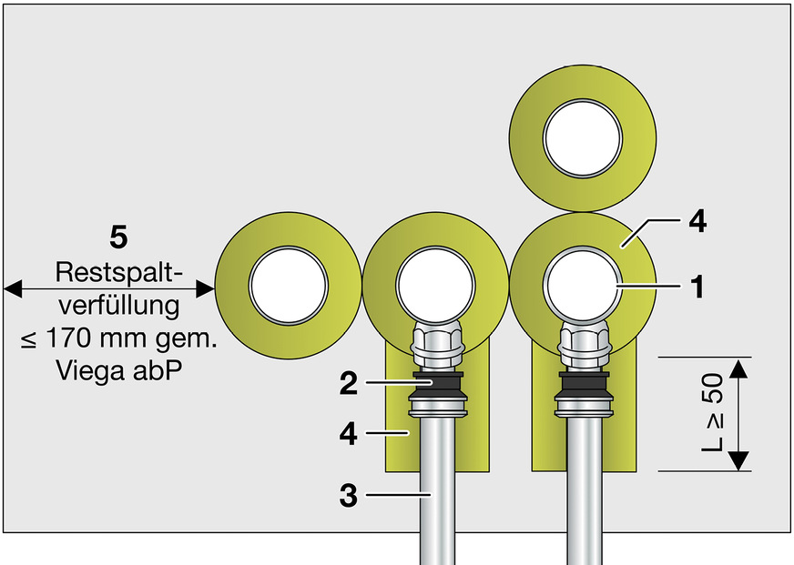 Um diese Vorgaben zwischen den unterschiedlichen Brandschutzsystemen unterschreiten zu dürfen, muss in Brandschutzprüfungen die Wirksamkeit jeder Kombination von Abschottungen auch ohne Mindestabstand nachgewiesen werden. Entsprechende Verweise dazu sind in der aBG zwingend erforderlich. Daher hat Viega seine Rohrleitungssysteme zu den gängigsten Fabrikaten anderer Ver- und Entsorgungsleitungen und deren Abschottungen auf Nullabstand prüfen lassen. Das bietet im Bauverlauf auch für die Schachtbelegung ein hohes Maß an Flexibilität, ohne die Brandschutzabnahme zu gefährden.