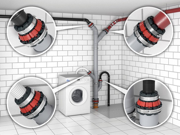 Für besondere Stabilität und konstante kraftschlüssige Verbindungen sorgen eine Manschette aus Ethylen-Propylen-Dien-Kautschuk (EPDM), flexible Kunststoffsegmente und zwei Edelstahlspannbänder. Aufgrund ihrer Korrosionsbeständigkeit, einer Resistenz gegen Kondensat sowie einer hohen Auszugsfestigkeit eignet sich die nach DIN EN 14241‑1 geprüfte Manschette für einen dauerhaften Einsatz im Innen- und im Außenbereich sowie auch im Erdreich. Für die einfache und schnelle Montage sind nur wenige Hilfsmittel notwendig.