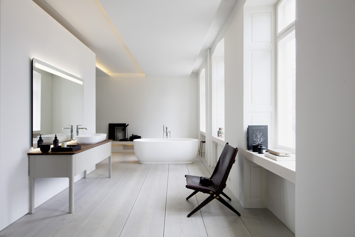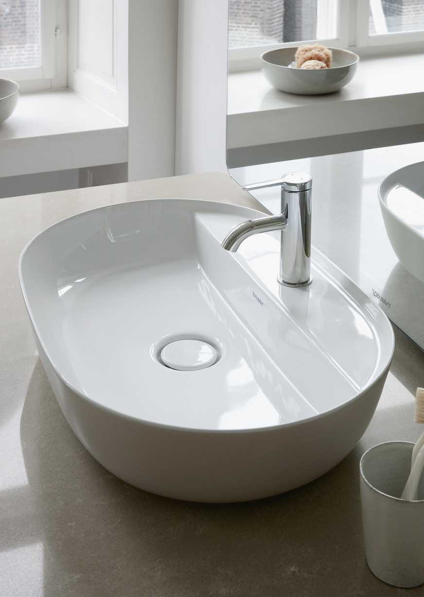 Eine mit Wasser gefüllte Schale auf dem Tisch diente Cecilie Manz als Inspiration für ein außergewöhnliches Programm. Die dänische Designerin entwickelte aus diesem assoziativen Leitmotiv drei Aufsatzbecken und eine Badewannenform von hoher formaler Signifikanz. Der Dreiklang aus ovaler Grundform, aus großzügigem Innenraum und sanft geschwungener Linienführung charakterisiert eine Kollektion, die sowohl zu puristischer als auch zu eleganter Interpretation einlädt. Luv verbindet weiche Formen mit nordischem Purismus und betont emotionale Aspekte. Dafür sorgt neben den haptischen Vorzügen des Materials DuraCeram eine dezidiert subtile Farbwahl: Optional können seidenmatt glasierte Außenflächen in Weiß Matt, Grau oder Sand gewählt werden. Durch den Kontrast mit dem glänzend weiß glasierten Innenbecken entstehen so Einzelstücke von besonderer Optik und Haptik. Großzügige Konsolentische auf vier sanft geschwungenen, höhenverstellbaren Füßen unterstützen diesen Ansatz mit naturnahen Werkstoffen. Neben matt lackierten Oberflächen unterstreichen hier Konsolenplatten aus Massivholz oder Quarzstein den dauerhaften Anspruch dieser Kollektion. Dazu passt optimal die Armaturenlinie C.1.