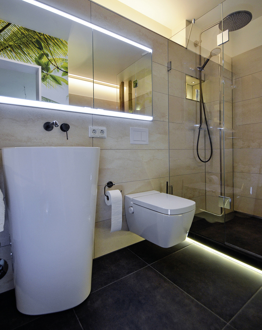 Auf der linken Seite ermöglicht eine vorgesetzte Trockenbauwand die technische Anbindung von WC und Waschtisch. Mit einer Gesamthöhe von 210 cm verbirgt sie aber nicht nur die Unterputzgestelle, sondern bietet auch Platz für weitere, praktische und optisch gewinnbringende Elemente. Eine integrierte LED-Leiste spendet über die gesamte Breite indirektes Licht und taucht den Raum mit ihrem dimmbaren, warm-weißen Licht in eine angenehme Atmosphäre.