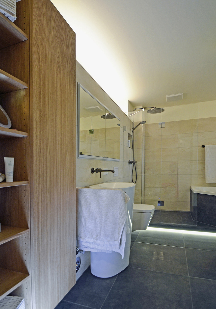 Das indirekte Licht über der Trockenbauwand ist extra schaltbar und auch dimmbar – passend für das Duschritual. Ein deckenintegriertes LED-Profil über der Wannenlandschaft lässt ebenfalls dimmbares, warmweißes Licht an der Wand hinuntergleiten. Entweder für das Baderitual oder wenn mehr Licht im Raum gewünscht wird. Das LED-Band im Auftritt der Duschzone ist per Bewegungsmelder gesteuert und wirft bei Nacht automatisch seinen Lichtschein über die dunklen Bodenfliesen. Zusätzlich macht es auf die Stufe zum Duschbereich aufmerksam.