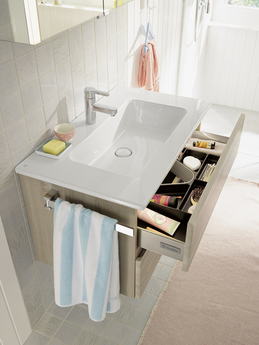 Das gleichnamige Möbelprogramm ergänzt burgbad um eine Keramikkollektion in gleicher Formensprache. Die variantenreiche Auswahl bietet Flächen- und Aufsatzwaschtische sowie Gästelösungen in Keramik, Glas und Mineralguss. Zentrales Gestaltungselement ist das Rechteck, das übergangslos in eine gerundete, präzise Kumme überführt wird. Neben den Waschtischen mit schmutzabweisender Oberfläche in drei Breiten ist der speziell für Kleinbäder neu konzipierte Keramikwaschtisch mit einer reduzierten Ausladung von 430 mm erhältlich.