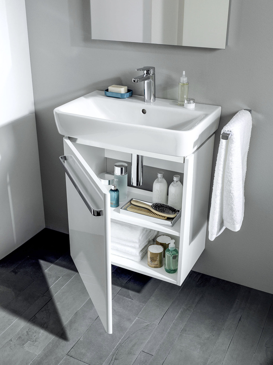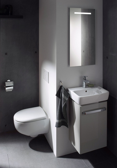 In kleinen Bädern muss sich der Waschtisch optimal nach dem Grundriss richten. Modelle, bei denen Ablagen und Armatur seitlich statt hinten sitzen, sowie Ecklösungen schenken genügend Bewegungsfreiheit. Den nötigen Stauraum schaffen Unterschränke, die passend zu jedem Becken erhältlich sind. Die Kontur der Unterschränke ist leicht zurückgesetzt und verleiht den Waschtischen so optische Leichtigkeit. Auch am WC lässt sich Platz sparen: Die Ausladung der Wand-WCs der Serie Geberit Renova Compact ist mit 48 cm oder 48,5 cm bei der Ausführung Square gegenüber Standard-WCs um einige Zentimeter verkürzt. Optional sind die Waschtisch- und WC-Keramiken mit der Spezialglasur KeraTect erhältlich.