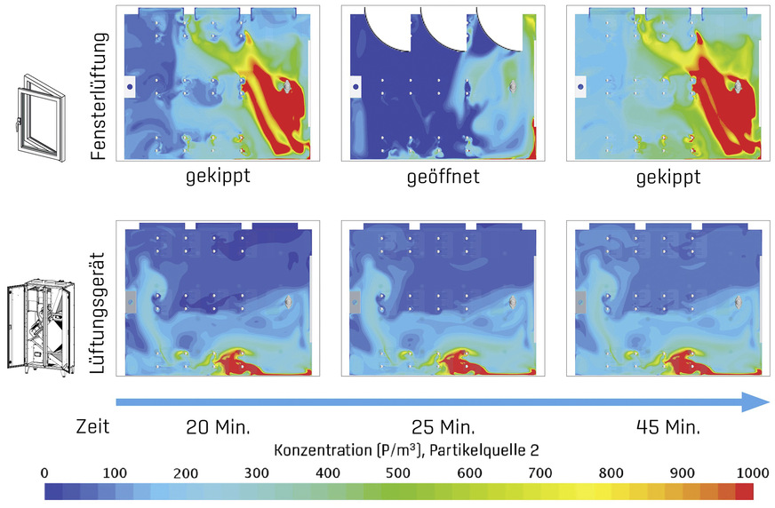 In der Simulation wurde mit einem fiktiven Gas gerechnet, welches ideal der Luftbewegung folgt und somit die Ausbreitung luftgetragener Partikel (Aerosole) abbildet. Je weiter entfernt die Partikelemission von einem gekippten Fenster stattfindet, desto größer wird das kontaminierte Raumvolumen, welches mehr als 900 infizierte Partikel pro m3 beinhalten kann.