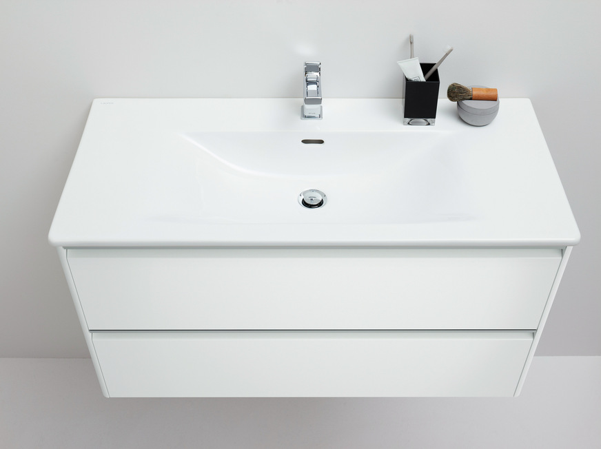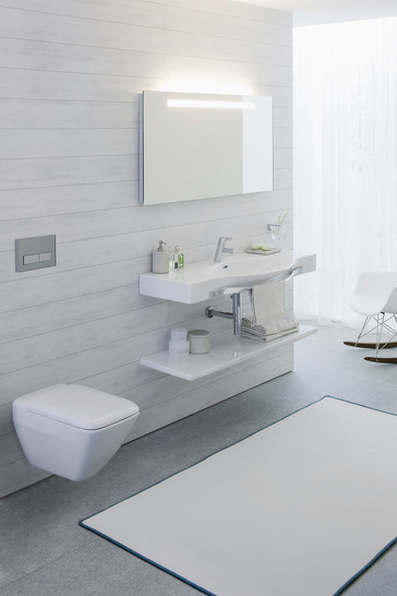 Außerdem gehören drei Einzelwaschtische und ein 150 cm breiter Doppelwaschtisch zum Programm von Palace. Die Einzelwaschtische und der Doppelwaschtisch sind als Möbelwaschtisch mit Unterschrank erhältlich, dazu ist eine passende verchromte Handtuchreling wählbar. Ein spülrandloses Wand-WC, eine Stand-WC-Kombination sowie ein Wand-Bidet, alle mit versteckten „EasyFit“-Befestigungen, vervollständigen Palace. Darauf abgestimmt ist Case für Palace, ein Möbelprogramm in zeitlos-reduziertem Design. Speziell für Hotels hat Laufen auch Keramikablagen in den Abmessungen der Waschtischkonsolen entwickelt, die sich einfach befestigen und auf Maß schneiden lassen. Praktisch sind auch die vier vorkonfektionierten Waschplatzlösungen, bestehend aus den extra dünnen Waschtischen in den Größen 60, 80, 100 und 120 cm in Kombination mit dem Base-Unterbauschrank mit zwei Schubladenelementen.