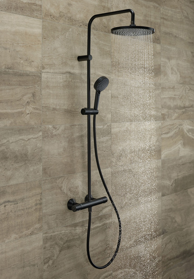 Mit der Vernis-Linie bietet Hansgrohe Duschsysteme, die eine elegante Optik in Mattschwarz mit ressourcenschonender Eco-Smart-Technologie kombinieren. An Fans von geradlinigen Silhouetten richtet sich die Vernis 240 Blend im viereckigen Format. Wer weiche Formen bevorzugt, liegt mit Vernis 240 Shape richtig, einer runden Kopfbrause mit einem Durchmesser von 240 mm. Dank optimierter Strahlnoppen, die das Wasser schneller abfließen lassen, beugen beide Designs laut Anbieter der Kalkbildung an der Strahlscheibe vor. Die Handbrause verfügt über zwei verschiedene Strahlarten und sorgt auch bei niedrigem Wasserdruck für ein angenehmes Duscherlebnis bei einem Verbrauch von maximal 9 Liter pro Minute. Dies ermöglicht die Variante mit Eco-Smart-Technologie. Integrierte Drehgelenke verhindern, dass sich der Duschschlauch nach der Abnahme der Handbrause von der Stange aus der Form biegt.