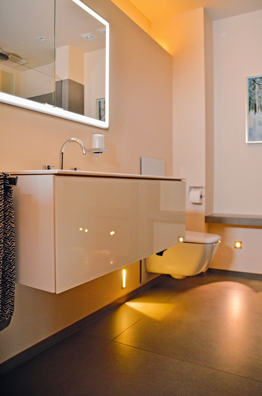 In der neu erstellten Abhangdecke sind LED-Leuchten verbaut. Sie sind in der Helligkeit dimmbar, in der Farbtemperatur steuerbar und erlauben automatisch gesteuertes, biodynamisches Licht, das zu jeder Zeit die für das Wohlbefinden des Nutzers richtige Lichttemperatur generiert. Das belebend wirkende, bläulich erscheinende morgendliche Sonnenlicht oder das abends eher rötliche und beruhigende Licht aus der Natur können auf diese Weise im Bad simuliert werden. Zudem lassen sich die Lichter in unterschiedlichen Farbtönen einstellen. Dies bedeutet nicht zwingend eine grelle Buntfarbe, sondern eher eine sanfte Tönung, die dem Raum eine individuelle Atmosphäre verleiht. Diesem Aspekt trägt die Wahl eher neutraler, zeitloser Töne in Farbe und Fliese Rechnung, da die Bewohner mit Farblicht jederzeit ihre eigenen Stimmungen erzeugen und unterstützen können.