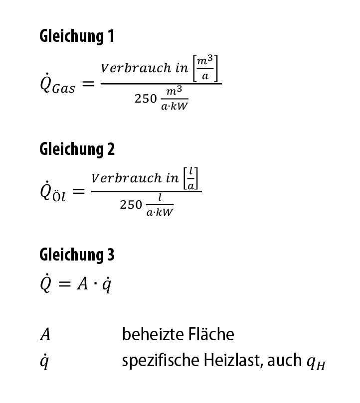 In bestehenden Objekten lässt sich bei einer Heizungsmodernisierung die Heizlast über den Brennstoffverbrauch der alten Heizungsanlage anhand der Gleichung 1 für Gasheizungen und anhand der Gleichung 2 für Ölheizungen abschätzen. Um den Einfluss extrem kalter oder warmer Jahre auszugleichen, sollte der Brennstoffverbrauch über mehrere Jahre gemittelt werden.