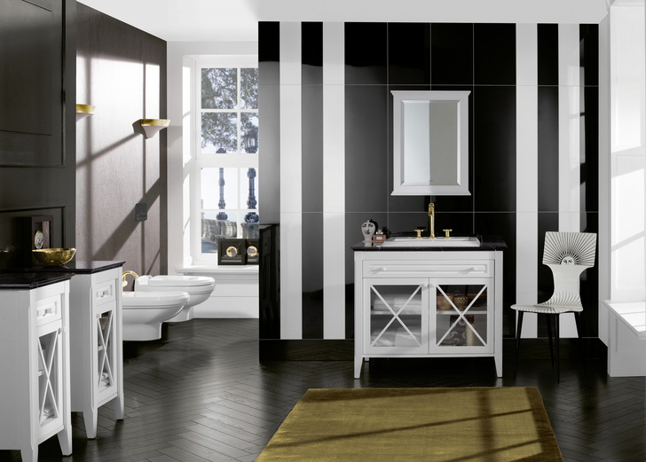 Inspiriert von den opulenten Badezimmern vornehmer Stadtwohnungen und Häuser, die Anfang des vergangenen Jahrhunderts in den damaligen Weltmetropolen Berlin, London und Paris eingerichtet wurden, hat der Designer Reiner Moll eine Retrokollektion mit Waschtisch, WC, Badewanne sowie Möbeln entworfen, die diesen ästhetischen Ansprüchen gerecht werden soll. Die traditionellen Formen lassen Hommage ausgesprochen prägnant erscheinen und geben ihr eine klassisch stilvolle Anmutung. Die feinen Stufen als typische dekorative Elemente nehmen der Keramik die Härte, und das Holz der Möbel verleiht dem gesamten Bad eine elegante Note. Die aufeinander abgestimmten Sanitärelemente und das passende Möbelprogramm wirken komfortabel, luxuriös und zugleich behaglich, harmonisch sowie dekorativ.