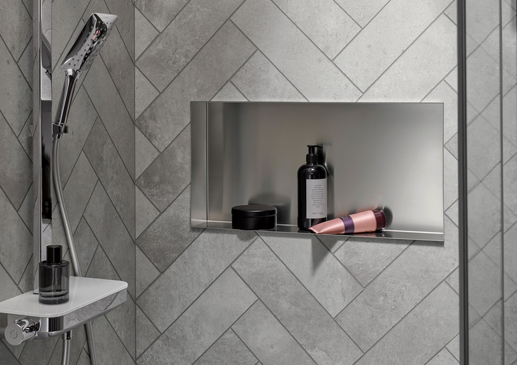 Der Wandausschnitt, in dem die Box eingelassen werden soll, muss um 5 mm größer sein als die Wandbox. Nach dem Ausschnitt wird sie zur Befestigung verschraubt oder verklebt. Als nächster Schritt wird der Flächenkleber aufgebracht und die Dichtmanschette verklebt. Die Abdichtung erfolgt hier mit der Abdichtmanschette nach DIN 18 543. Zuletzt wird die Designbox eingesetzt und mit Silikon abgedichtet. Schnell und einfach kann so mehr Ablagefläche in der Nasszelle erreicht werden. Es gibt die Boxen in Edelstahllook oder Schwarz-matt.