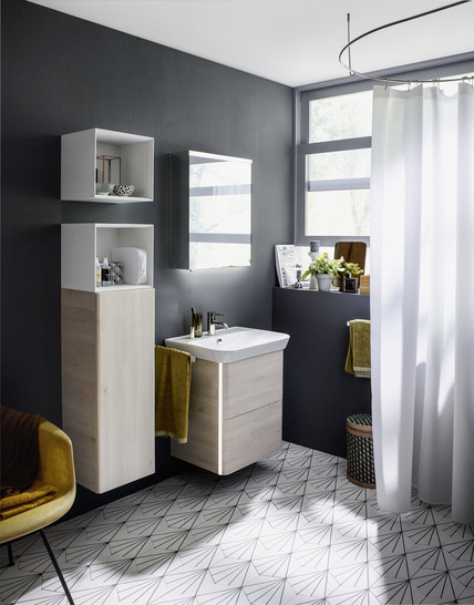 Auszüge und Türen werden bei Waschtisch und Schränken mithilfe einer seitlichen vertikalen Griffleiste geöffnet, deren hintergreifbare Aussparung farblich abgesetzt gestaltet ist und beim Waschtischunterschrank sogar mit Hinterleuchtung gewählt werden kann. Zusätzlich zur Inneneinteilung fehlt beim oberen Auszug der platzraubende Siphonausschnitt. Mögliche Oberflächenvarianten sind Weiß Hochglanz, Eiche Dekor Merino und Eiche Dekor Flanelle. Die Ergänzungsschränke haben optionale Extras wie Innenschublade, Wäschekippe sowie eine innen verspiegelte Tür im Programm. Ein offenes, kubisches Regalelement ergänzt das Repertoire.Erwähnenswert ist außerdem der mit 1000 mm Durchmesser kreisrunde Leuchtspiegel.