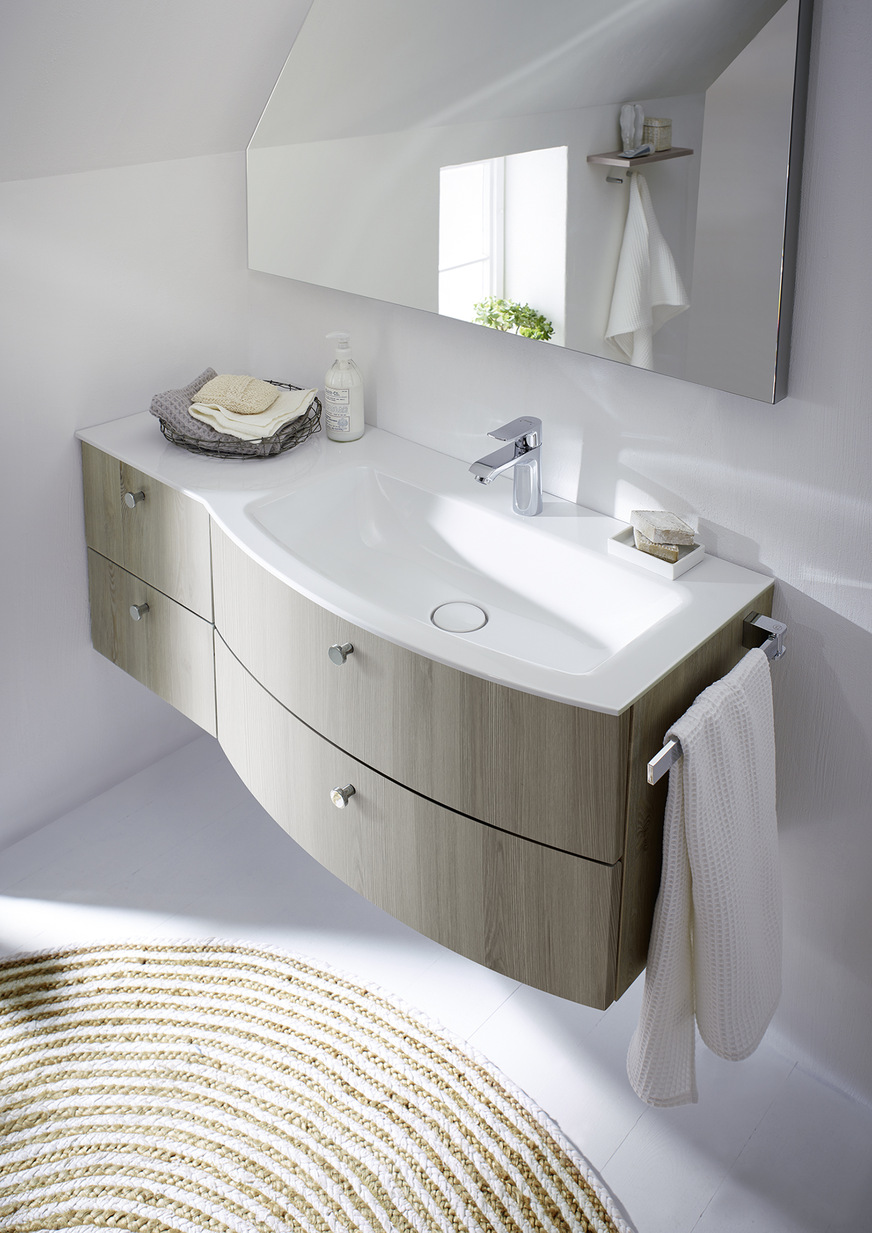 Wer maßgeschneiderte Einbausituationen wie ein passgenau unter die Dachschräge geschmiegtes Bad braucht, hat die Lösung in Form von zwei keramischen Waschtischen (rund und eckig), die bis zu einer Breite von 1410 mm vollständig maßflexibel gefertigt werden. Und dies in präzise gerundeter und rundum glasierter Qualität, sodass am fertigen Produkt keine unglasierten Flächen zu sehen sind. Auch Aufsatzbecken (Keramik und Mineralguss) in rund, eckig oder oval mit und ohne Armaturenbank sind lieferbar. Glaswaschtische gibt es in 9 Farbvarianten, jeweils in Matt und Hochglanz.