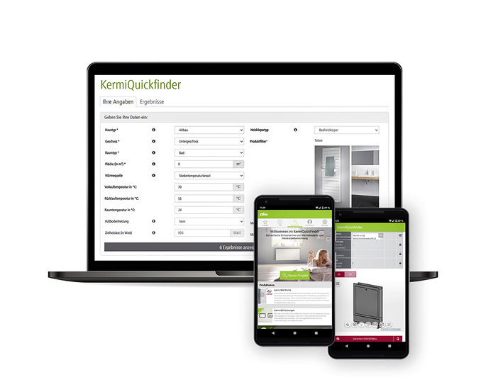 Der KermiQuickfinder steht für die einfache Wärmebedarfs- und Heizkörperermittlung. Die App präsentiert sich in erweitertem Umfang. Das Kermi-BIM-Portal wurde integriert. Somit können die planenden Fachpartner auch auf mobilen Endgeräten die BIM-Geometrien der wichtigsten Kermi-Produktgruppen in 40 CAD-Formaten generieren. Durch den Quickfinder lassen sich auf Grundlage von Haustyp und Systemtemperaturen die überschlägige Raumheizlast und die dafür geeigneten Heizkörpermodelle ermitteln. Das ausgewählte Produkt und die technischen Daten (Anschlusspositionen, Befestigung) können als PDF-Datenblatt ausgedruckt oder per E-Mail versendet werden. Im Kermi-BIM-Portal können Daten für die BIM-Methode zu den Produktgruppen Heizkörper, Fußbodenheizung, Wärmepumpe und -speicher, Wohnraumlüftung sowie Duschkabine und Duschplatz generiert werden. Der KermiQuickfinder steht als Web-App-Version und als native Android- und iOS-App kostenlos zur Verfügung. Die Web-Version des BIM-Portals ist aufrufbar über: