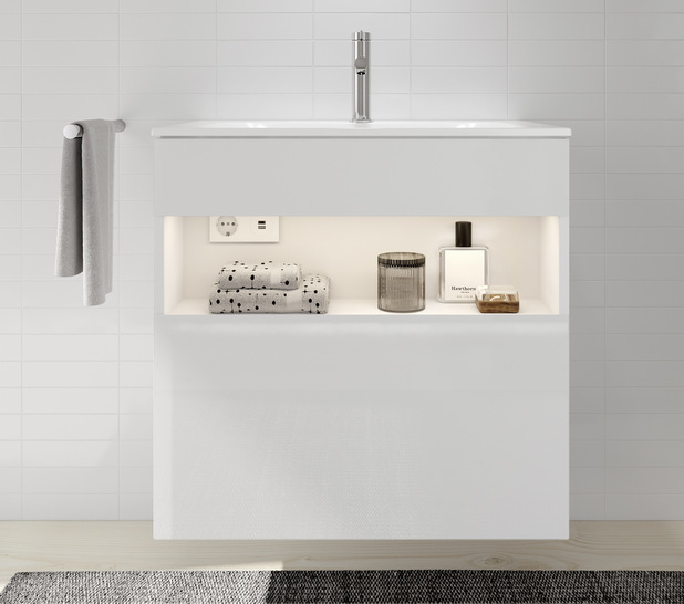 Mit der Möbelkollektion Stageline von Keuco hält wohnliche Atmosphäre Einzug ins Bad. Optisches Highlight der Serie ist ein offenes, illuminiertes Ablagefach, das Dekorationsstücke und Lieblingsprodukte gekonnt in Szene setzt. Die LED-Beleuchtung von warmweißen 3000 K wird extern über die Raumschaltung gesteuert. Praktisches Ausstattungsdetail sind die ins Fach integrierte Steckdose sowie die USB- und USB-C-Ladestelle. Die Möbelserie (entworfen vom Designbüro Tesseraux + Partner) zeigt sich geradlinig und schlicht in einem Ton-in-Ton-Look. So sind Glasfront und Korpus der Möbel stets in einer Farbe gehalten.