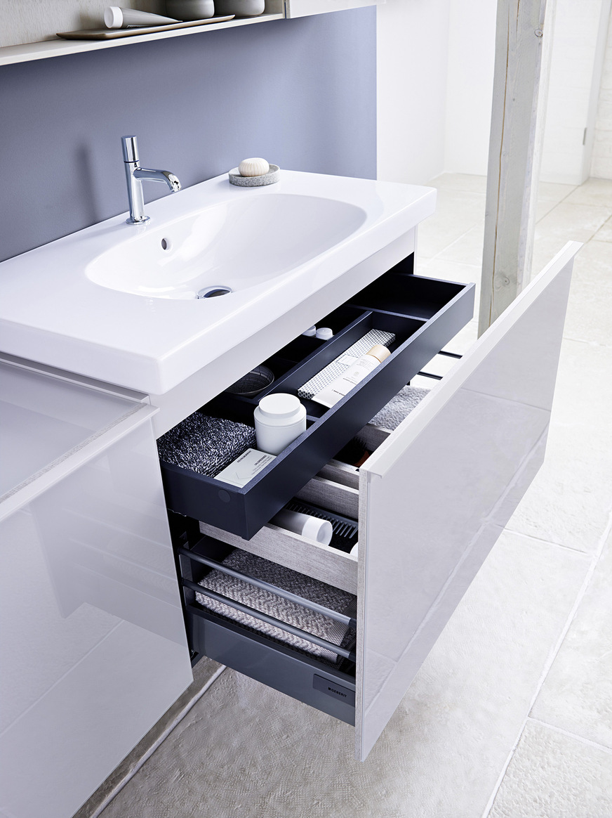 Das Möbelprogramm verfügt über clevere Stauraumlösungen. Die Sanitärkeramiken zeichnen sich durch sanfte organische Formen in harmonischer Verbindung mit geraden Linien aus. Bei den Badmöbeln sind unterschiedliche Materialien wie Glas, Holzdekor, Metall und Lack miteinander kombiniert. Sie können als reine Waschplatzlösung mit Waschtisch, Waschtischunterschrank und Spiegelschrank oder als Konzeptlösung eingesetzt werden. Besonders variantenreich sind die Hochschränke, z. B. als schmale, raumsparende Variante mit Apothekerauszug. Der Spiegelschrank ist an der inneren Rückseite vollflächig mit einem Spiegel und mit Licht ausgestattet, während beide Flügeltüren über Ablagefächer verfügen. Alle benötigten Dinge sind so immer in Reichweite.