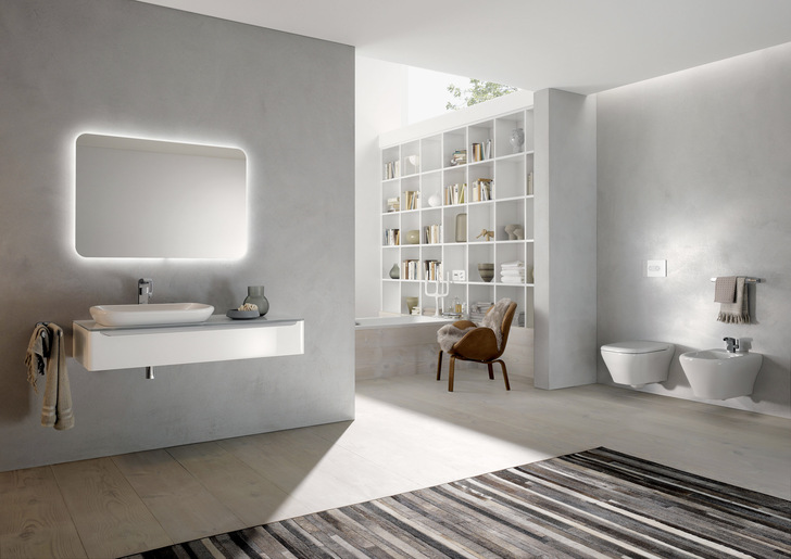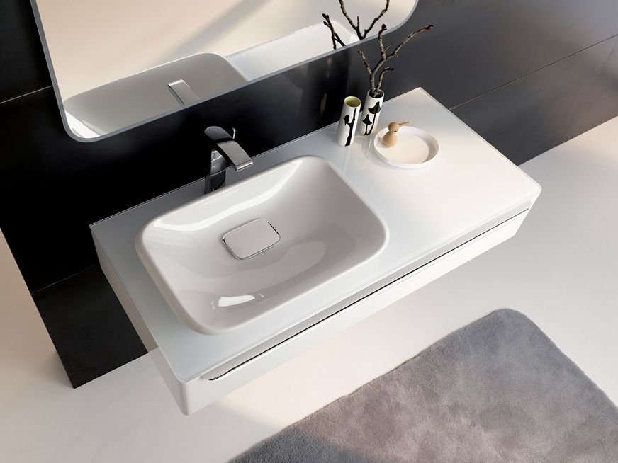 Auch die schlichte Gestaltung des wandhängenden WCs und Bidets harmoniert. Auffällig sind die sanft geschwungene Seitengestaltung und die sich nach unten verjüngende Formgebung. Auch das Möbelprogramm in zwei Farben, dessen softe Grundlinie sich sowohl bei den Objekten als auch bei den Griffen wiederfindet, setzt auf Formgebung und Funktionalität. Die Serie umfasst zudem Waschtische, einen Doppelwaschtisch, Einbauwaschtisch, Handwaschbecken, Tiefspül-WC (spülrandlos, in geschlossener Form), Bidet, Waschtischunterschränke, einen Hochschrank mit Tür und einen Lichtspiegel.