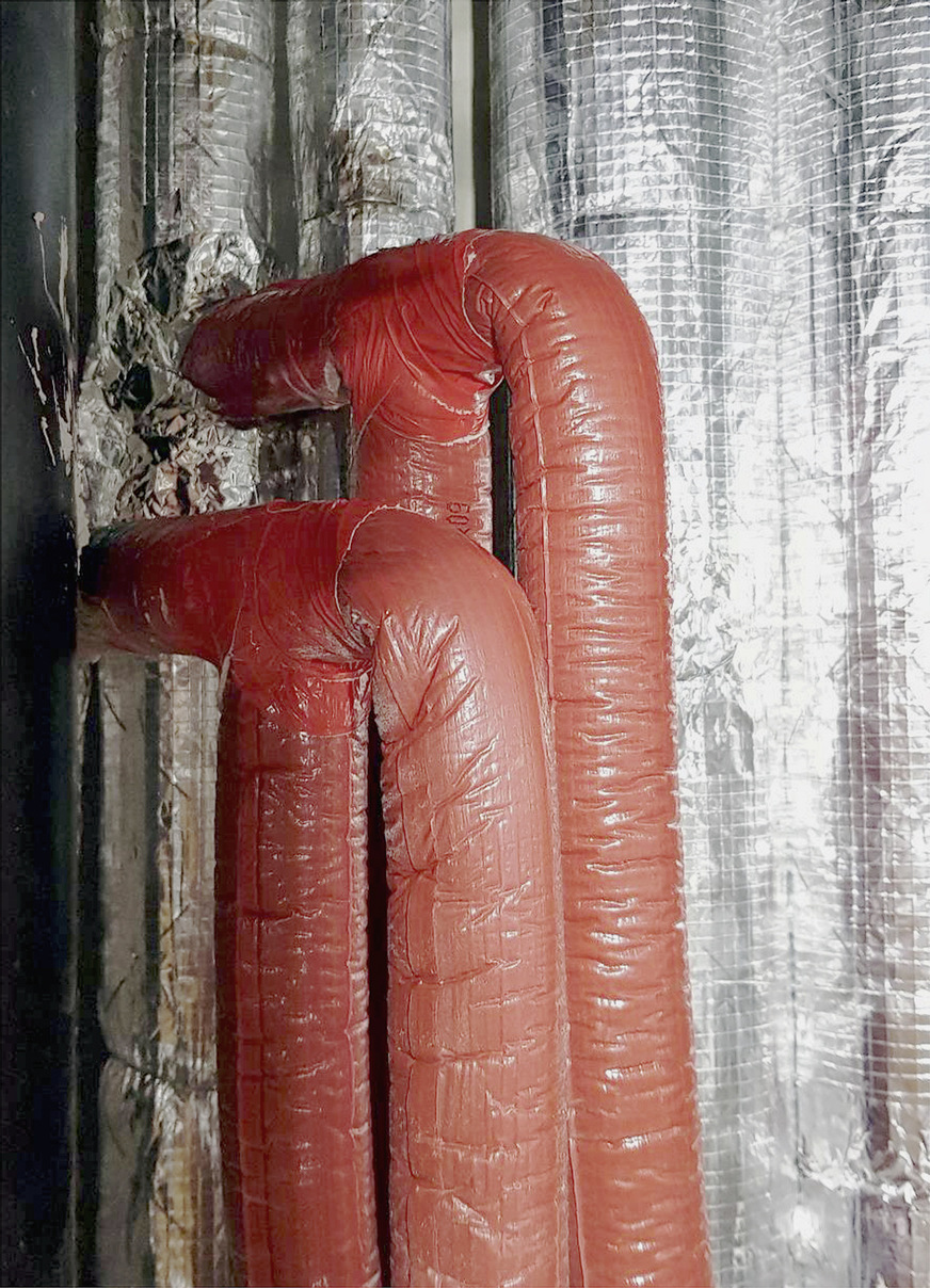 Sollen Leitungstrassen in abgehängten Decken verlaufen, entstehen dort schnell Dauertemperaturen von über 30 °C – bedingt durch die Wärmeabgabe der Medien für Heizung und Warmwasser, durch die aufsteigende Raumwärme und eventuell noch durch Deckenleuchten. Diese Wärmelasten wirken direkt auf die Kaltwasser führenden Rohrleitungen.