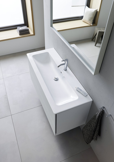 Neben Weiß sind die Keramikteile auch in Weiß Seidenmatt erhältlich. Die Kombination mit dem Möbelprogramm L-cube unterstreicht die minimalistische Ausrichtung der Badserie, die sich in unterschiedlichste Stilwelten einfügt.