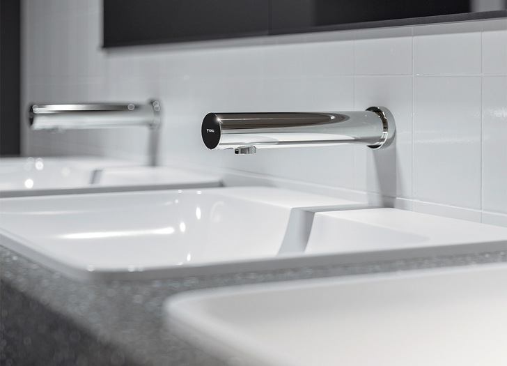 Im öffentlichen Sanitärraum sind berührungslose Sensorarmaturen eine hygienisch sinnvolle Maßnahme. Mit „Modus E“ hat Schell Armaturen und Lösungen für den öffentlichen und halböffentlichen Sanitärraum entwickelt. Die Produktlinie besteht aus Waschtisch- und Wandauslaufarmaturen. Mit der infrarotgesteuerten, berührungslosen Bedienung erfüllen sie die Voraussetzungen zum Schutz der Gesundheit. Dabei sorgt das vor Vandalismus geschützte Design laut Anbieter für Langlebigkeit. Die wassersparenden Armaturen haben einen robusten Metallkörper und sind mit einer Sicherung gegen eine bewusste Blockade des Infrarotsensors ausgestattet (zum Beispiel durch Kaugummi). Der Wasserfluss stoppt automatisch bei einem Dauerimpuls von mehr als 60 Sekunden, so lassen sich Wasservergeudung und Überschwemmungen vermeiden. Zusätzlich ist bei „Modus E“ die Elektronik gegen unsachgemäße Verpolung bei der Installation sicher geschützt.