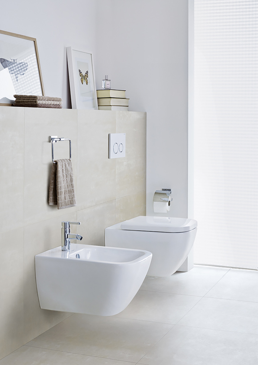 Als perfekte Ergänzung dieser sinnlichen Linie dient die Armaturenserie C.1. Die Wand-WCs sind mit Rimless-Technologie und SensoWash-Dusch-WC-Sitz möglich.