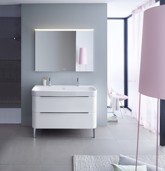 Mit Happy D.2 beweist sieger design Feingefühl und präsentiert eine Badserie, die höchste Eleganz und zeitlose Modernität bietet. Sanft abgerundete Ecken und die anmutige Komposition geometrischer Grundformen ziehen sich durch das gesamte Programm. Synchrone Radien prägen Waschschalen mit großzügigem Innenvolumen. Bei den Unterbauten setzen filigrane Chromgriffleisten feine Kontraste. Sie unterstreichen perfekt gewählte Proportionen und betonen das harmonische Zusammenspiel planer Flächen und charakteristischer Rundungen. Die Unterbauten sind in fünf Breiten lieferbar, wahlweise mit oder ohne Chromfüße. Fünf verschiedene Oberflächen sorgen darüber hinaus für vielfältige Berührungspunkte zu verschiedenen Facetten der modernen Badeinrichtung. Neben klassischem Weiß Hochglanz oder Naturholz bringt Happy D.2 mit seiner textilen Dekoroberfläche Leinen eine angenehme Haptik ins Bad.
