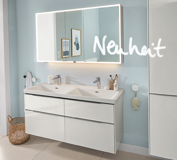 Möbel: Waschtischunterschränke, Seitenschränke, Hochschränke, offene Spiegelregale, ein Sideboard, optional mit Schubladen- und Bodenbeleuchtung, Smart-Home-fähig