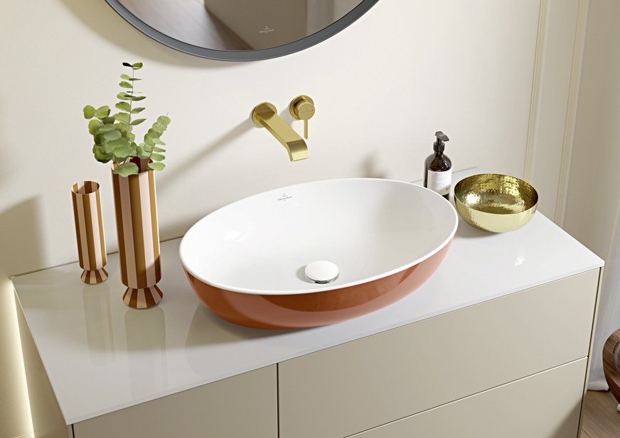Die Serie Artis von Villeroy & Boch zeichnet sich durch ihre besonders filigrane Keramik aus. Die fein und leicht wirkenden Aufsatzwaschtische werden in vier Formen angeboten: rund, oval, rechteckig und quadratisch. Die tiefen, funktionalen Becken bieten neben einer attraktiven Optik auch besten Nutzungskomfort. Das Farbkonzept der Artis-Serie wurde von der deutsch-dänischen Designerin Gesa Hansen mitentwickelt, die vom AD Magazin zu den 200 wichtigsten Design Influencern gezählt wird. Während die Außenseite von Artis farbige Akzente im Bad setzt, bleibt die Innenseite Weiß. Neu 2021 sind die Bicolour-Farbtöne Indian Summer, Sage Green, Rust und Bordeaux.