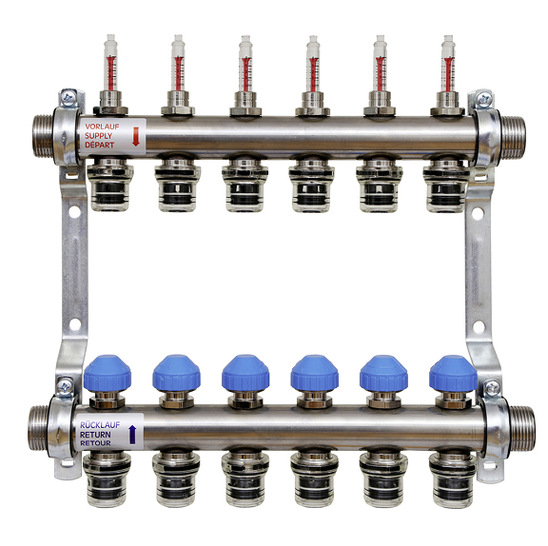 Die Armaturen des Heizkreisverteilers, der fertig montiert auf einer Wandhalterung geliefert wird, sind überwiegend aus Messing, das Verteilerrohr aus Edelstahl (1.4301). Außerdem verfügt er über absperrbare Durchflussmesser mit besonders geringem Druckverlust. Seine Regulier- und Absperrventile mit Adaption M 30 x 1,5 eignen sich für alle gängigen Stellantriebe.