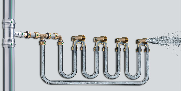 Besonders in einem so sensiblen Bereich wie der Trinkwasserinstallation mit unbestimmbaren Faktoren während der Betriebszeit kommt vornehmlich der Werkstoffwahl besondere Bedeutung zu ( Bild 5 ). Die täglichen Betriebsbedingungen können dabei nicht mit den möglichen Einflussfaktoren (mechanischen Kräften wie Druckstößen oder Längenausdehnung) gleichgesetzt werden. In der zu erwartenden Lebenszeit einer Anlage überwiegen in erster Linie die vorbestimmten Kriterien wie Temperatur, Druck, Wasserbeschaffenheit und Fließgeschwindigkeit. Eine Rohrleitung muss jedoch auch einen Störfall unbeschadet überstehen können oder kurzzeitig höheren Temperaturen, wie durch thermische Desinfektion, standhalten.